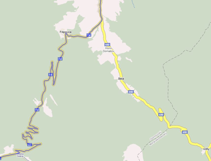 Jestem z Rybnika wiec moja trasa wyglada tak: Racibórz ->Opava -> Bruntal (droga 450)-> Karlova Studenka-> Horni Domasov -> przed Jesenikiem odbijam na Sumperk droga 44.