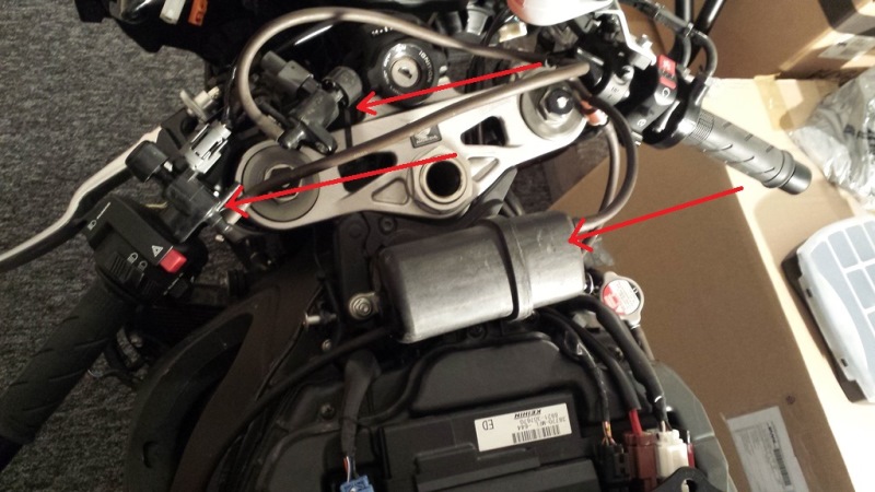 Motocykl kupiłem z zdemontowanymi owiewkami i niektórymi częściami w kartonie. Teraz pojawiają się pytania którymi wcześniej nie zawracałem sobie głowy i byłbym bardzo wdzięczny za pomoc, a mianowicie: do czego służą dwa czujniki i "puszka" które oznaczyłem na zdjęciu? Domyślam się że to czujniki ciśnienia, ale gdzie były oryginalnie zainstalowane? A może są tylko od "ekologii" i mogę się tego pozbyć? Obawiam się że jak odpalę motocykl bez nich to wejdzie "error" i narobię sobie niepotrzebnych problemów.