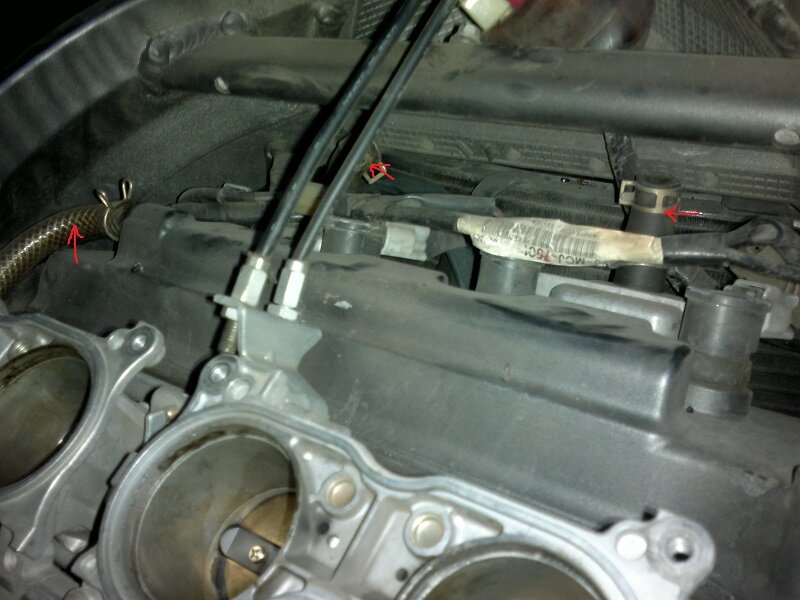 Wąż po lewej idzie sobie na dół i zwisa luzem, a te dwa króćce, są zaślepione! Chyba coś tu nie gra i nie wiem czemu tak to jest zrobione. Zaznaczam że moto latam już 2 sezon i wszystko jest ok.