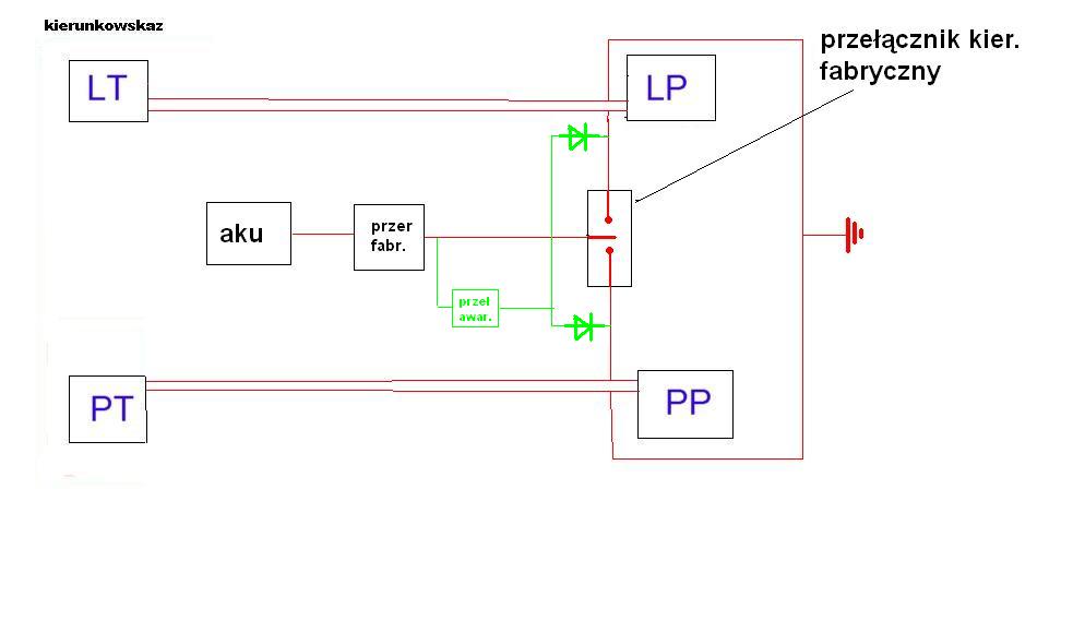+ z aku na krotkim kabelku laczysz z bezpiecznikiem potem podlaczasz przerywacz z przerywacza kabelkiem do przelacznika proste? Do przelacznika dolanczasz dwie diody jedna dioda idzie na plus kierukowskazu lewego druga do prawego i dziala