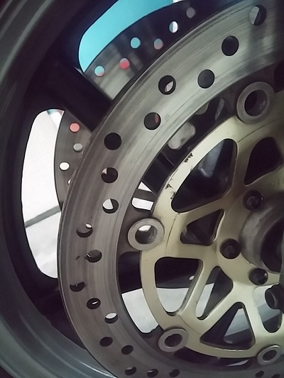 Myślę że to co zobaczyłem kiedy zakręciłem kołem mi wystarczy, ta tarcza dosłownie faluje, a ta z prawej strony jest prosta, nie ma żadnego falowania. No i po zdjęciu zacisku z tej krzywej tarczy nic już nie tarło. Z resztą zobacz na foto jak nierówno łapią na niej klocki, u dołu się błyszczy, a u góry jest ciemna. Tak czy siak będę kupował 2 tarcze, więc w razie potrzeby zmienię obie