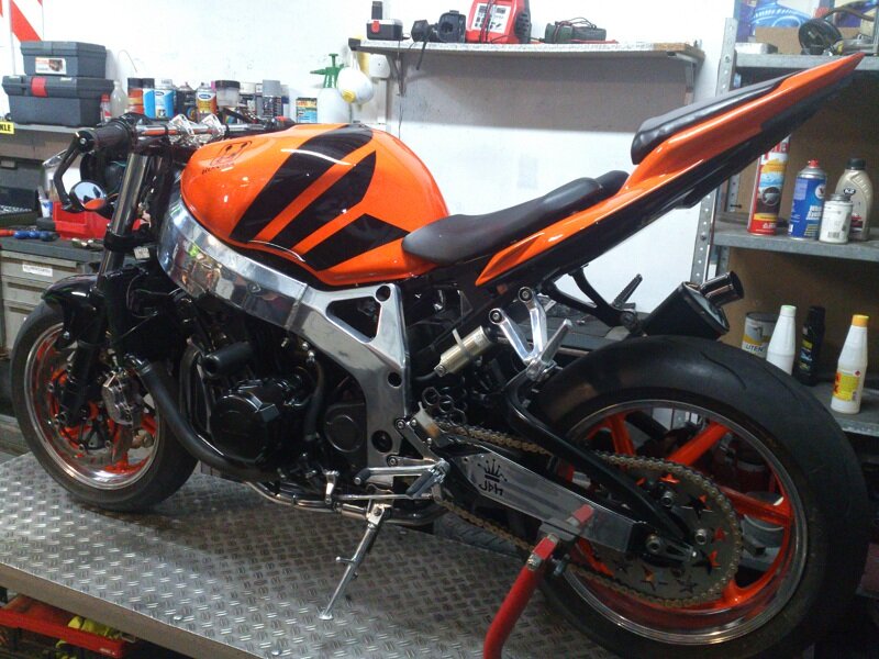 Silnik jest już złożony i pomalowany na czarny półmat..Felgi dziś piaskowałem i jutro polerka rantów + malowanie reszty... Wszelkie graty mam już na stanie i czekają na montaż...Nowa kierka (drag bar), bi ksenony, nowy zbiornik paliwa, wszystkie nowe linki, lusterka bar end, nowe opony, elementy aluminiowe i kolektor spolerowany na błysk, osłony setów wycinane na wodzie(kastety z logo customfighters), zębatka na kole chromowana... W tym tygodniu również moto będzie malowane nowym lakierem (pomarańcz palety MaxMeyer), więc myślę ze do końca listopada wrzucę fotki z efektem końcowym...Pozdrawiam