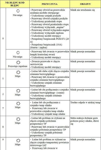 Czytasz to tak: gdy świeci się kontrolka bledu przez 3 sekundy to jest równoznaczne z dziesiątkami czyli jak mruga ci wolno raz to jest to rownoznaczne z 1_ , jak dwa razy to z 2_ i tak dalej, i po długich mrugnięciach zaczyna szybko mrugać i to oznacza jedności na przykład, 1 mrugnięcie jest długie a następnie dwa szybkie to oznacza błąd 12 i szukasz tego w tabeli, i tak odczytujesz kazdy inny błąd