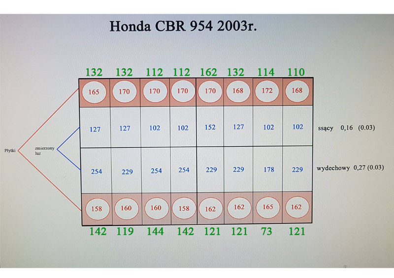 Nigdy tego nie robiłem dlatego wolałem się zapytać żeby czegoś nie spaprać. Dałem wczoraj moje pomiary do mechanika który ma serwis motocyklowy tutaj w Londynie. Płytki wyliczył i zamówił. Wyliczenia ogólnie się różnią od Twoich. Na zielono to co on obliczył, jeśli pomiar wyszedł poniżej 1.20 płytka będzie właśnie taka. Mimo wszystko dzięki za pomoc. Pozdrawiam