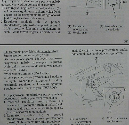Jak w tytule, ma ktoś wiarygodne nastawy standardowe tylnego zawieszenia? Od razu zaznaczam, że mam ściągniętą instrukcję, ale myślę, że jest w niej błąd, bo standardowe ustawienie regulatora na zbiorniczku ciśnieniowym ma być wykręcone o 9 obrotów, przeciwnie do ruchu wskazówek zegara, tyle, że ono się tyle nie da wykręcić. Możliwe, że dane są pomylone z regulatorem na dole amortyzatora, tak przypuszczam, czy ktoś pomoże?