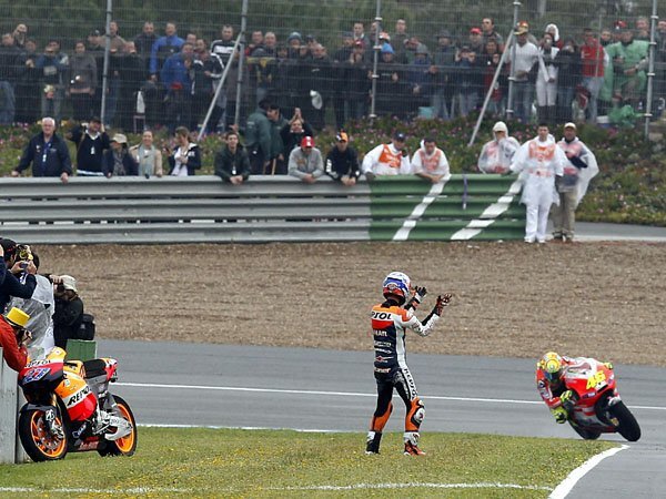 A konkretnie. Pierwszego dnia Rossi był po dwóch treningach 3. W drugim dniu był 6. Kwalifikacje na nie dostrojonym motocyklu(wywrotka na moto nr 1) - 12. Trening niedzielny pozycja 2.