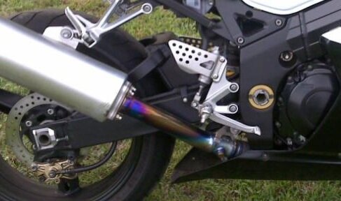 Jeśli chodzi o przebarwienia, to często można takie barwy zobaczyć w GSX-R-ach K3, K4. Myślę że jest to spowodowane właściwościami materiału użytego na ten odcinek wydechu. Po prostu jest mało odporny na temperaturę i stąd takie barwy. Wystarczy popatrzeć na fotki tych maszyn w ogłoszeniach, prawie każdy tak ma.