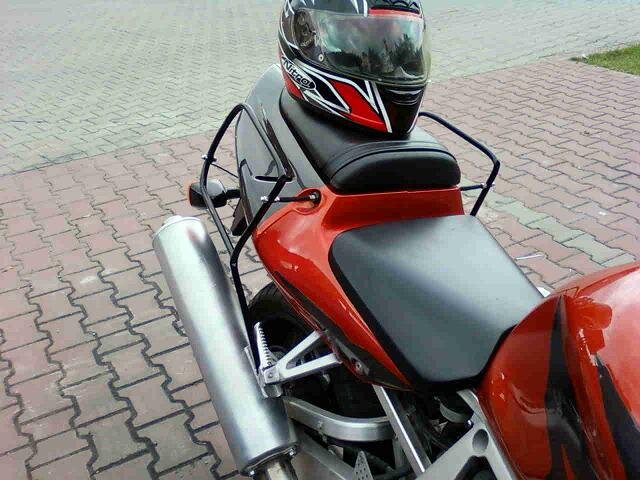 Walizki krauser, pewnie od jakiegoś BMW, stelaż od nich nieco pocięty i przystosowany do połączenia z dedykowanym bagażnikiem (można odkręcić stelaż pod kufry i zostawić sam bagażnik). Do tego bagażnik tak przerobiony, że nie trzeba zdejmować siedzenia pasażera, ani zamknięcia żeby go zdjąć. Wszystko zrobione tak, że zdjęcie/założenie to 6 śrub i jakieś 5 minut