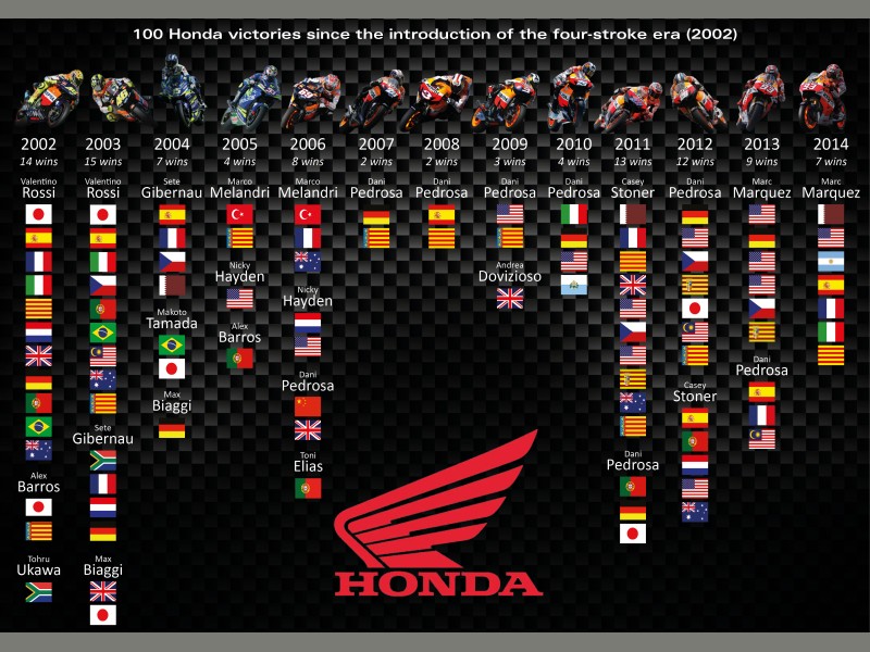 Wraz z 100 zwycięstwami w klasie MotoGP, Honda świętowala siedem tytulow konstruktorów (2002, 2003, 2004, 2006, 2011, 2012, 2013) i pięć mistrzostw kierowcow (2002, 2003, 2006, 2011, 2013).