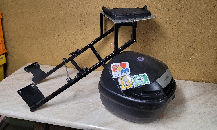 Stelaż robiłem samodzielnie z profili stalowych. Jest pomalowany podwójną warstwą farby. Przejechał ze mną kilka zagranicznych wypadów dopakowany dużo bardziej niz powinien. Ma 4 punkty podparcia i nie przeszkadza w jeździe z pasażerem. Dodatkowo od boku można zamontować sakwę. Stelaż da się rozkręcić i złożyć "na płasko".